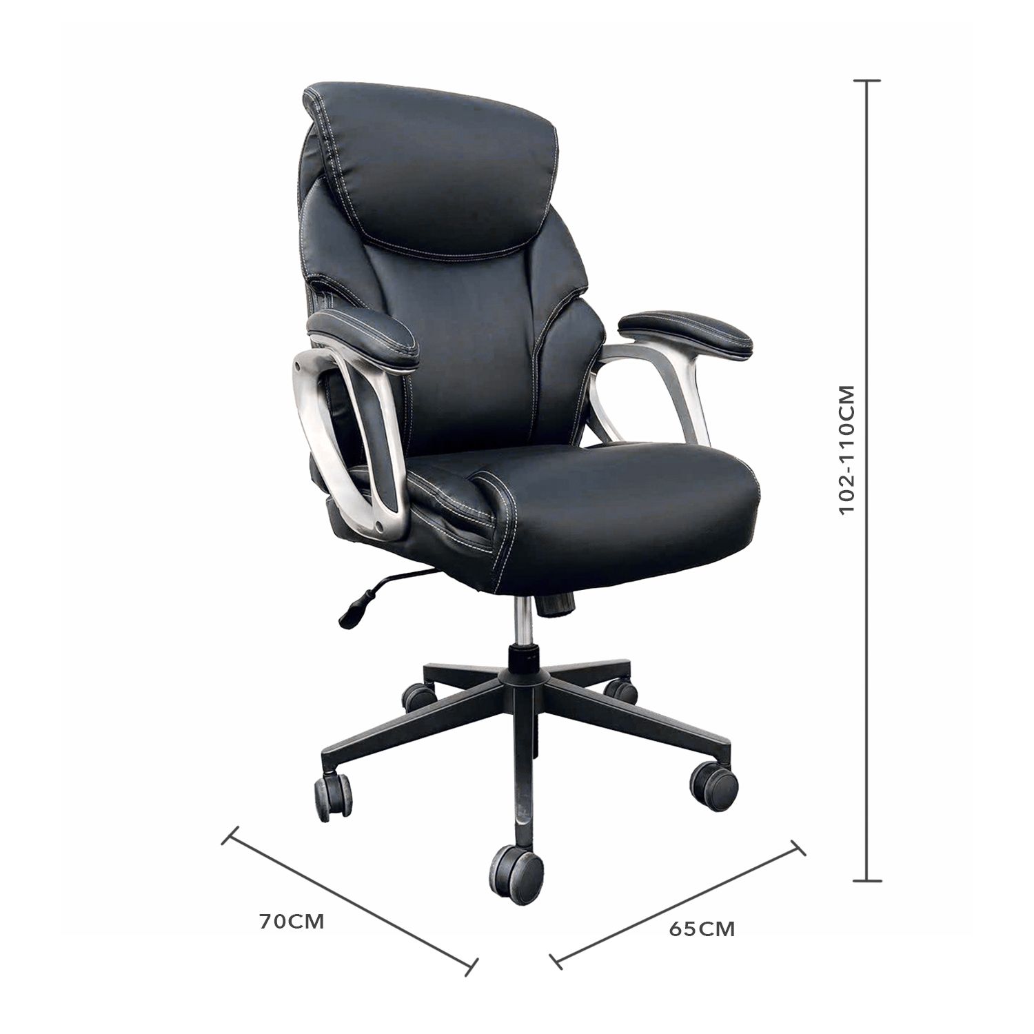 Thông số R65cm S70cm C102/110cm Chất liệu Hợp kim + gỗ + nhựa, nệm mút cao cấp, bọc da PU, bánh xe nhựa đúc Màu sắc Đen Ứng dụng Ghế xoay giám đốc, ghế xoay da, ghế xoay xuất khẩu Bảo hành 12 tháng